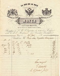 (LES GANTS DU PRINCE LOUIS NAPOLÉON BONAPARTE) - FACTURE de la Maison « MAYER GANTIER breveté, pour les Gants de bals boutonnés et lacés à la Médicis, Fournisseur de L’Impératrice de toutes les Russies et de Mesdames les Grandes Duchesse ;...