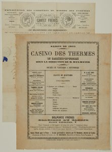 Publicité de l’époque en marges « Delporte Frères Glaciers du Casino place Napoléon, 7 » « Messagerie Adolphe Ribettes, calèches de promenades et voyage », etc. – Impr. 1 page (27 x 21), à Bagnères-de-Bigorre, chez J. M. Dossun, 9 Place Napoléon.