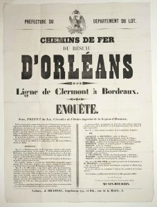 LOT. 1864. « CHEMINS DE FER DU RÉSEAU D’ORLÉANS. CRÉATION DE LA « LIGNE DE CLERMONT A BORDEAUX. » Placard (64 x 48).