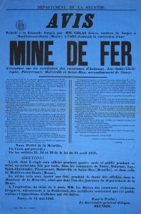 (1869. MEURTHE-ET-MOSELLE. MEUSE. MINE DE FER) «AVIS relatif à la demande formée par MM. COLAS Frères, Maître de Forges à MONTIERS-SUR-SAULX (Meuse), à l’effet d’obtenir la concession d’une MINE DE FER s’étendant sur les territoires...