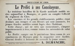 «…le 3° Bataillon de la Garde Nationale mobile arrive à BOURGES, et porte au complet l’effectif du Régiment du CHER. Les casernes et les grands établissements publics étant destinés aux troupes et aux blessées qui sont annoncés, les jeunes Gardes mobiles seront logés chez l’habitant.