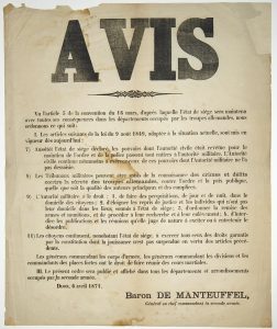 DIJON (CÔTE D’OR) 6 Avril 1871. AVIS du Baron DE MANTEUFFEL, Général en chef Commandant la seconde armée (d’occupation.). Placard (55 x 44)