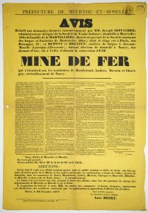 «AVIS relatif aux demandes formées concurremment par MM. Joseph SÉPULCHCRE, administrateur délégué de la Société de Vezin-Aulnoye, domicilié à Maxéville ; Alfred-Camille de la MARTILLIÈRE, Directeur-gérant de la Société Anonyme des forges et fonderies de MONTATAIRE (OISE), dont le siège est à Paris, rue Béranger, 31, et DUPONT et DREYFUS, maître de forges à ARS-SUR-MOSELLE (Lorraine-Allemande), faisant élection de domicile à NANCY, rue Jeanne-d’Arc, 10, à l’effet d’obtenir la concession d’une MINE DE FER qui s’étendrait sur les territoires de Houdemont, Ludres, Messein et Chavigny, arrondissement de NANCY. »
