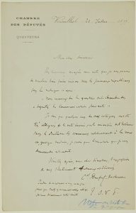 “Mon cher Sénateur” - Il demande de faire insérer une note dans les journaux républicains sous la rubrique ci-après : Nous recevons de la Questure de la chambre des députés la communication suivante. Je sais que quelques uns de mes collègues ont été très indignés de la note insérée par le Ministère de l’Intérieur dans le Bulletin des Communes relativement à la Revue et, quoique tardive, je crois que l’insertion que je vous demande est utile...”