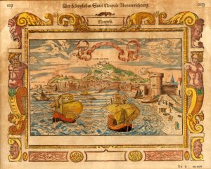 [ITALIE/NAPLES]Der Königlichen Statt Neapels Abconcraschtung. S.l.n.d. Vue gravée et aquarellée (360 x 285 mm), encadrée et sous verre.