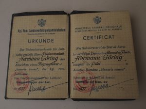 Certificat de pilote de guerre pour la flotte aérienne roumaine à titre honorifique au nom du Maréchal du Reich Hermann Göring. Document établi par le sous-secrétariat d'état de l'aviation roumaine.
