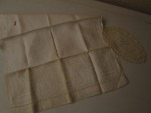 SERVIETTE DE TABLE blanche en damassé (Format 33x46). Aux deux extrémités, finition « jour Venise ». Monogramme A H (A. Hitler)
