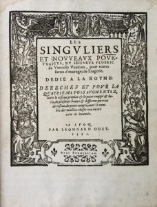Cet ouvrage curieux s'ouvre par un portrait d'Henri IV en médaillon et se compose de 115 patrons de dentelles et broderies, imprimés pour ceux de la première partie sur un seul feuillet ; C'est Léonard Odet, tailleur d'histoires, imprimeur et libraire lyonnais qui a entièrement gravé ce livre pour dames, qui se révèle comme un véritable tour de force typographique.