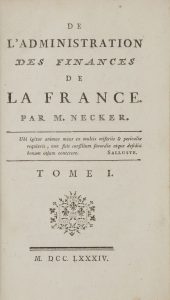 NECKER (Jacques). - De l’administration des finances de la France. S.l., [Lausanne : Jean-Pierre Heubach], 1784. — 3 volumes in-8, 195 x 120 : VI, clix, 352 pp., 1 tableau ; VI, 536 pp. ; VII, 468 pp.