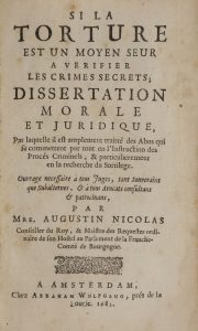 NICOLAS (Augustin). - Si la torture est un moyen seur a verifier les crimes secrets ; dissertation morale et juridique, Par laquelle il est amplement traitté des Abus qui se commettent par tout en l’Instruction des Procés Criminels, &...