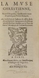 Lachèvre, Bibliographie des recueils collectifs de poésies du XVIe siècle 1502-1609, pp. 211-213. - Bremond, Histoire littéraire du sentiment religieux en France, I, p. 199.Publiée par un certain I.C.T, cette anthologie s’inspire de l’Œuvre chrestienne de tous les poètes francois parue à Lyon l’année précédente. Remaniée et amplement augmenté, elle débute par Avant-propos de 60 pages où le prêtre qui colligea l’ouvrage semble s’accommoder des Muses païennes mais non de la propagande protestante.