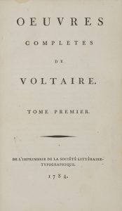 ♦ Célèbre édition, dite de « Kehl », publiée sous la direction de Condorcet et Decroix, imprimée par Beaumarchais dans l’imprimerie que celui-ci avait installée spécialement au fort de Kehl, avec les caractères gravés par Basquerville qu’il avait récemment acquis.