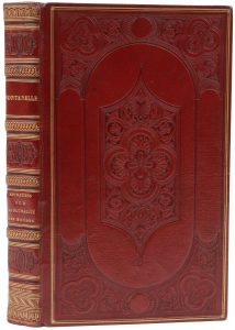 Maroquin rouge, double filet doré en bordures des plats, encadrant une plaque à froid formée d’un encadrement à compartiments ornés de feuillages et de trilobes, et au centre d’un quadrilobe entouré de feuillages et de palmettes, dos à faux nerfs orné de fers à froid et de roulettes dorées, roulette dorée intérieure, tranches dorées (Simier R. du Roi).