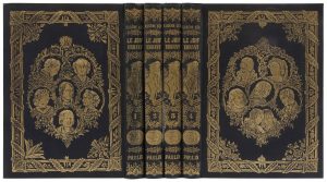 Percaline bleue à chevrons, plats ornés de plaques spéciales représentant, au centre d’un large cadre de fleurs et de feuillages, les portraits des principaux personnages du roman dans des encadrements floraux, dos lisse orné de fers spéciaux dont celui du juif-errant (cartonnage de l’éditeur).