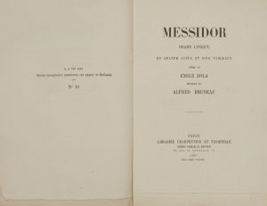 ZOLA (Émile). - Messidor, drame lyrique en quatre actes et cinq tableaux. Paris : Librairie Charpentier et Fasquelle, 1897. — In-18, 204 x 135 : 69 pp., (1 f. blanc), couverture imprimée.