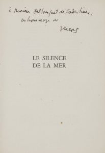 ─ [*]. VERCORS (pseud. de Jean Bruller). Le Silence de la mer. Récit. 1944. [Envoi de l’auteur à Jean Delbousquet. Joint une très intéressante note critique autographe de ce dernier, signée des initiales de son pseudonyme J(ean) d(e) C(ordestieux))