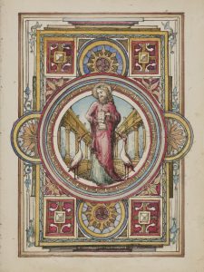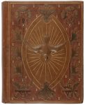 Veau fauve, premier plat orné d’un décor modelé composé au centre d’une colombe au-dessus d’un soleil rayonnant doré à l’intérieur d’un grand ovale de deux filets dorés, le tout entouré de chardons et de fleurs modelés et rehaussés en vert, ainsi que d’un semé d’hermines dorées sur un fond criblé de points à froid, double filet doré en bordure du premier plat et filet doré simple en bordure du second plat, dos lisse ; encadrement de veau fauve à l’intérieur, orné de fleurs et d’étoiles dorées, doublures et gardes de soie moirée blanche, tranches dorées, boîte recouverte de papier bordeaux (reliure de l’époque).