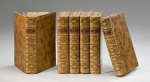 Dos à 5 nerfs cloisonnés et fleuronnés portant les pièces de titre en maroquin rouge, filet doré sur les coupes, tranches jaspées de rouge.