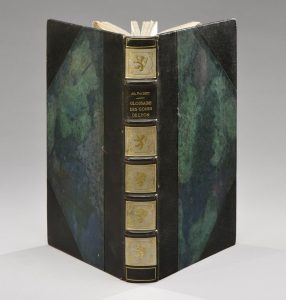 Dos à 5 nerfs décoré de palettes héraldique entre les nerfs, d'une roulette dorée sur les nerfs, d'un grand fer doré en pied du dos et portant le titre doré, premier plat de la couverture conservé.