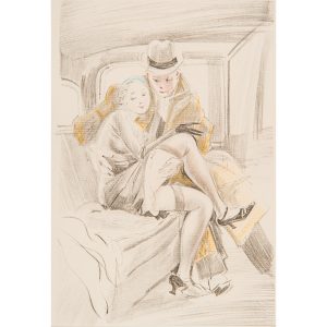 « Le trait délicat et sûr de l’artiste représente magnifiquement cette rencontre amoureuse dans l’atmosphère parisienne des années 1930. Le chef-d’œuvre imprimé de Rojan et l’un des plus beaux portefeuilles érotiques du XXème ».