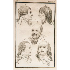 PLANE J.-M. Physiologie, ou L’Art de connaîitre les hommes sur leur physionomie. Meudon, Imprimerie P. S. C. Demailly, 1797 ; 2 vol. in-8, demi-chagrin vert sombre à coins de vélin, dos lisses à faux nerfs dorés, tranches rouges.