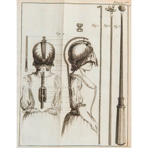 Seize belles planches repliées, assez curieuses pour certaines, montrant des instruments chirurgicaux, des coupes anatomiques et des dispositifs de soin adaptés sur des patients.