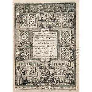 Ouvrage divisé en deux parties, chacune introduite par un beau titre frontispice gravé, le premier gravé par Gaultier montrant des scientifiques discutant dans un jardin, le second gravé par Gaspard Isaac montrant l’intérieur d’une pharmacie.