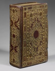 Maroquin rouge, dos lisse et plats recouverts d'un décor à petits fers dorés et mosaïqué de maroquin olive, tranches dorées, fermoirs (reliure vers 1630).