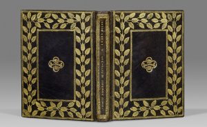 ▬ Vers 1800, le Comte Fitz-Gibbon de Clare a fait dorer au centre des plats son chiffre dans un filet quadrilobé contenant un sanglier, sa devise “Nil admirari” et son chiffre ; il a sans doute également fait dorer le titre en long sur le dos.