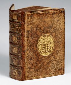 Veau fauve à marbrures au pinceau, dos à nerfs orné de caissons de filets dorés avec chiffre doré répété, triple filet doré encadrant les plats avec armes dorées au centre, tranches jaspées (reliure du XVIIe siècle).