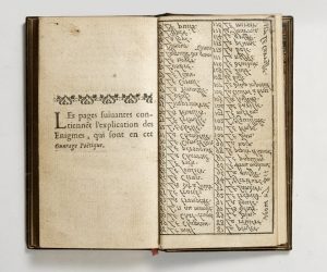 Elle comprend à la fin une table des mots de 118 énigmes, laquelle étant gravée à l'envers, ne peut être lue qu'avec le secours d'un miroir.