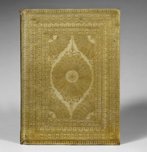 Vélin souple, dos lisse orné, plats entièrement recouverts d'un riche décor doré à l'éventail contenu dans une succession d'encadrements de filets et roulettes, tranches dorées (reliure italienne de l' époque).