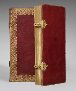 Maroquin rouge, dos à nerfs orné de caissons de filets dorés, filet doré encadrant les plats, coupes décorées, doublures de maroquin rouge ornée d'une large dentelle dorée, tranches dorées, fermoirs en métal doré ouvragé (reliure de l' époque).