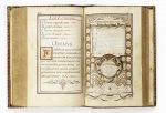 Maroquin rouge, dos à nerfs richement orné, large dentelle encadrant les plats, roulette dorée sur les coupes et en bordure intérieure, tranches dorées (reliure de l' époque).