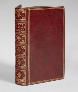 Maroquin rouge, dos à nerfs orné, triple filet doré encadrant les plats, coupes décorées, doublures de maroquin rouge encadrées d'une roulette et d'un filet dorés, tranches dorées sur marbrures (reliure de l' époque).