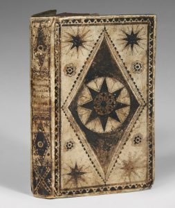 Vélin rigide, dos lisse et plats entièrement recouverts d'un décor géométrique dessiné et peint à l'encre brune, tranches rouges (reliure de la fin du XVIIIe siècle).
