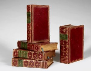 6 tomes en 5 volumes petit in-8 [environ 170 x 107 mm] : maroquin souple rouge, dos lisses joliment ornés, pièces de titre de maroquin vert, roulettes dorées encadrant les plats, bordures intérieures décorées, tranches dorées (reliures uniformes de l' époque).