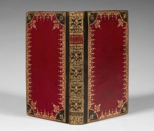Maroquin bicolore, dos de maroquin bleu nuit lisse orné avec, en pied, en lettres dorées le nom de “Brunck”, pièce de titre de maroquin rouge, dentelle dorée encadrant les plats de maroquin rouge avec fleurons dorés dans les angles de maroquin bleu nuit, coupes et bordures intérieures décorées, tranches dorées et ciselées (reliure de l' époque).