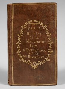 Veau fauve flammé, dos lisse joliment orné, pièce de titre de maroquin rouge, triple filet doré encadrant les plats avec, au centre, grande inscription en lettres dorées et encadrée de feuillage portant “Paris. Hospice de la maternité. Prix d'Émulation.