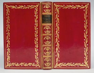 Demi-maroquin, dos lisse recouvert de papier vernissé rouge orné d'un décor doré au pinceau, pièce de titre de maroquin noir, plats de papier vernissé rouge ornés d'un encadrement de filet et guirlande dorés peints, coupes décorées, doublures et gardes de soie bleue, encadrement intérieur de filet et roulette dorés, tranches dorées (reliure de l' époque au vernis Bertin).