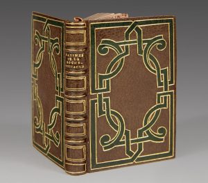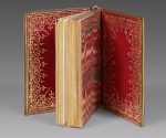 Maroquin tabac, dos à nerfs orné de caissons de filets dorés, décor doré et mosaïqué sur les plats d'entrelacs de listels de maroquin vert, coupes filetées or, doublures de maroquin rouge ornées d'une large dentelle dorée, tranches dorées sur marbrures, étui moderne de maroquin brun (Gruel).