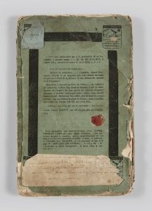 Couverture de papier vert imprimée et ornementée avec, sur le premier plat, restes de cachet de cire rouge.