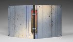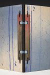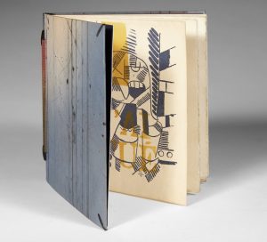 Demi-veau noir gaufré “petits carrés”, bords des mors recouverts de colonnes demi-rondes de veau en deux tons gaufrées “petits carrés”, prolongées en tête et en queue d'une barrette d'ébène, plats souples en veau blanc peint d'un fond bleuté et monotype noir, barrette d'ébène dans les angles, doublures de nubuck rouge, gardes de nubuck bleu, entièrement non rogné, couverture illustrée conservée, étui en demi-veau bleu (Jean de Gonet, 1995).