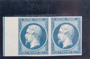 25c bleu Présidence en paire avec filet d’encadrement (pli horizontal) très frais dans pochette plastique.