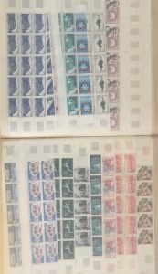 timbres-poste neufs, par multiples, entre les années 1960 et 1980, dans un classeur de feuilles.
