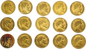 Napoléon III tête nue, 1852 A, 1853 A (3 ex.),1854 A (3 ex.), 1855A, 1856 A (3 ex.),1857 A (2 ex.), 1858 A (2 ex.).