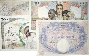 500 Francs (BLEU et ROSE) - type 1888 du 22-1-1928 . Fay.30 TB. 5000 Francs (VICTOIRE) - type 1934 du 19-1-1939. Fay. 46 Sup. 5000 francs ( EMPIRE FRANÇAIS) - type 1942 du 24-5-1945. Fay. 47. TTB+