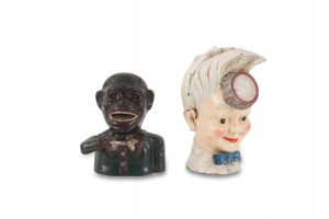 1 tirelire mécanique « Jolly Nigger Bank » avec système de bras articulé -1 ancienne tirelire en forme de tête de jeune garçon à la houppette portant une capsule de soda sur le front.