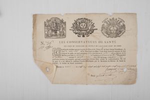 Pièce imprimée in-folio avec belle vignette gravée aux armes de la ville, contresignée par le secrétaire du bureau de Santé du district avec sceau (en partie arraché). Patente « donnée à Calvi » au Capitaine corse Paul, Maria Pasqualini et son équipage attestant que le port, la ville et ses mouillages sont exempts de peste ou mal contagieux et qu’en conséquence on peut leur donner libre entrée et communication.