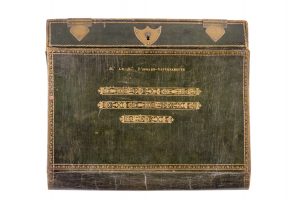 Portefeuille de service de Ministre secrétaire d’Etat. Maroquin vert doré aux petits fers, filets et roulettes ornés, nom sur le rabat, serrure et clé d’origine. Signé Garnesson au Palais Royal, cuir décousu par endroits. Début du XIXe.